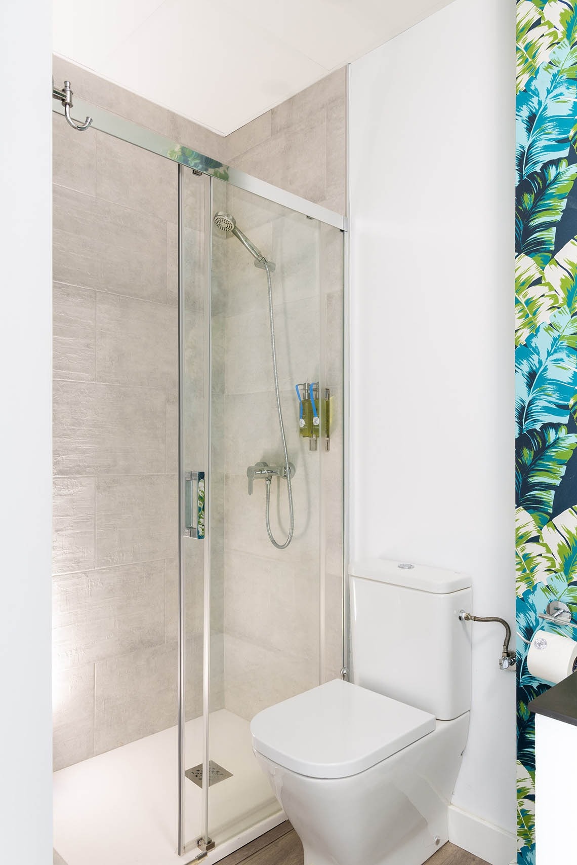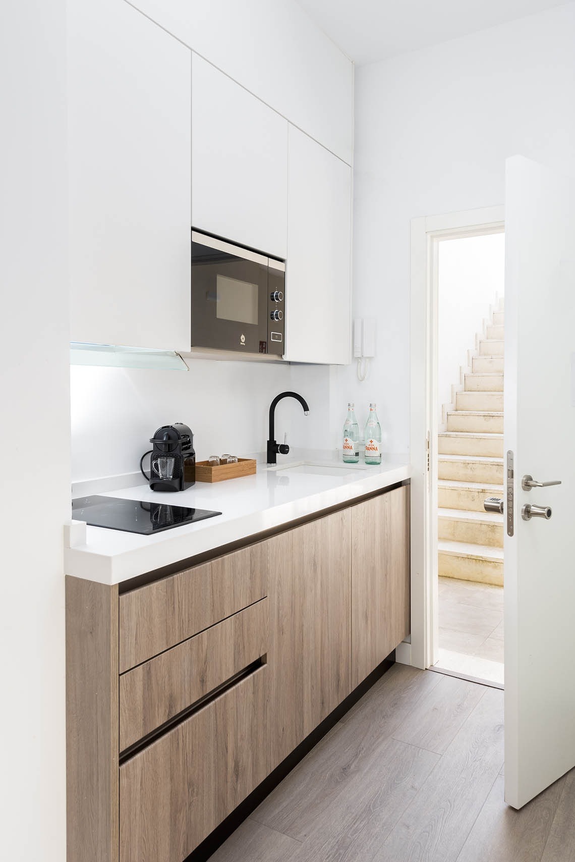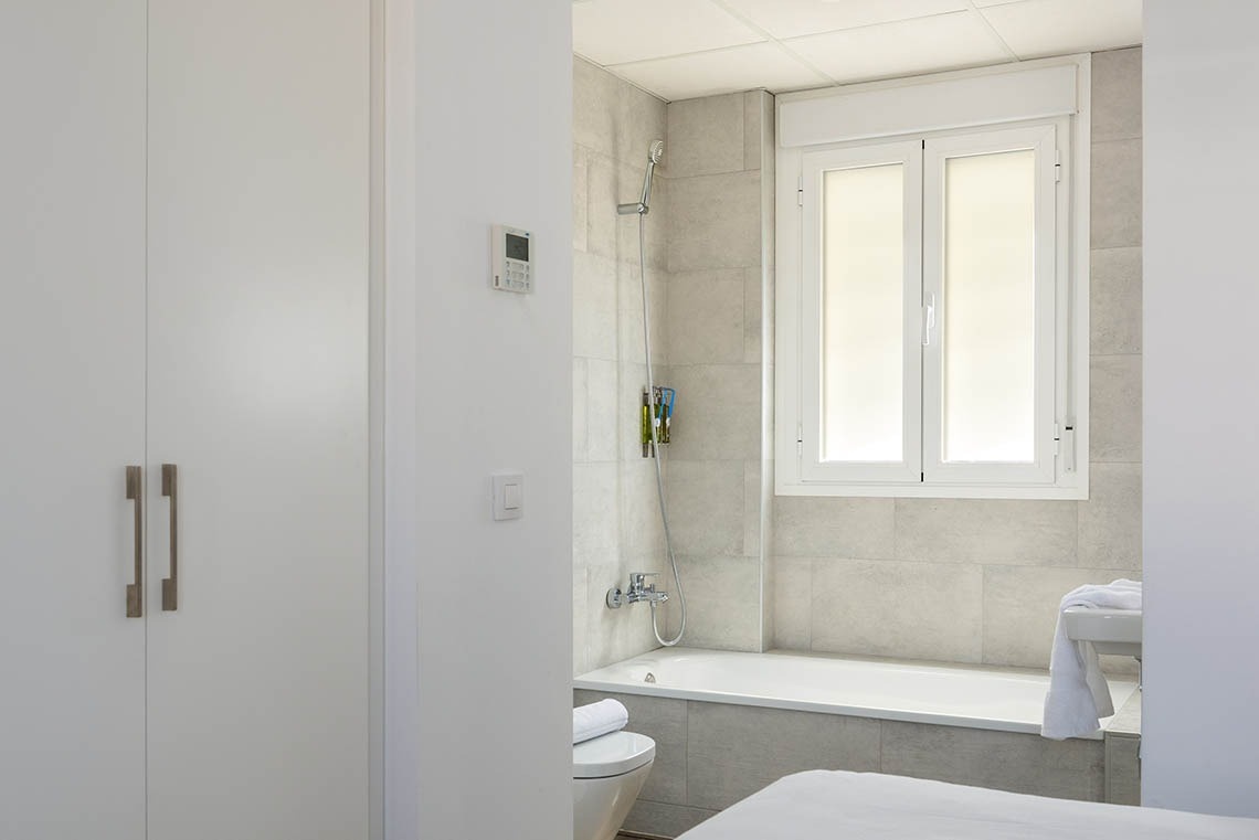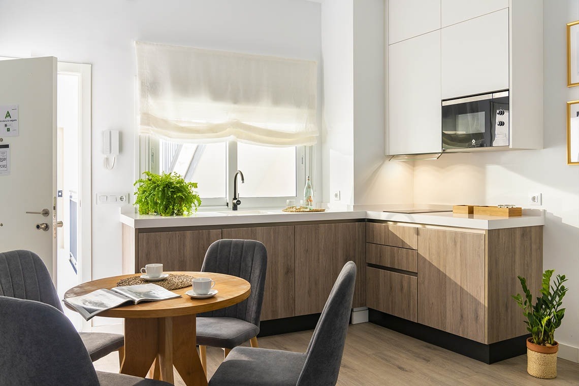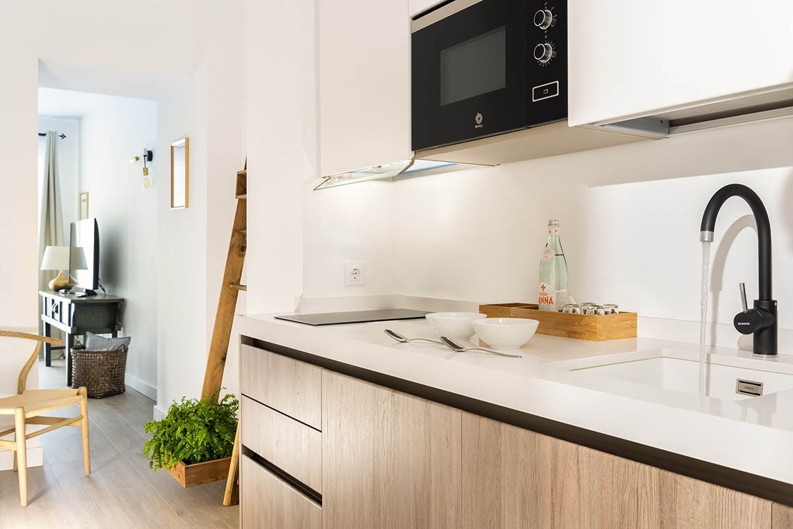 Nuestro apartamento con vistas al patio interior se compone de una zona abierta en la que conviven cocina y sala de estar en un mismo espacio. El dormitorio principal está equipado con una cama tamaño King Size (180 x200 cm) y zona de trabajo. El baño está totalmente equipado con ducha.