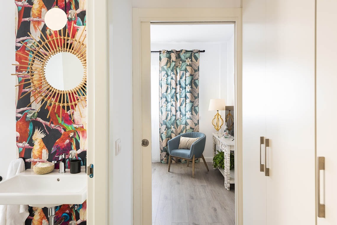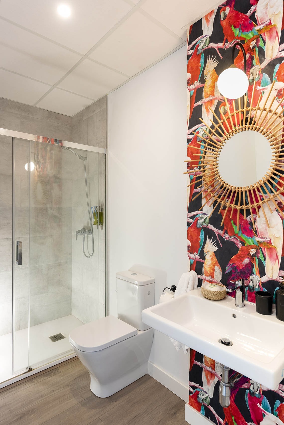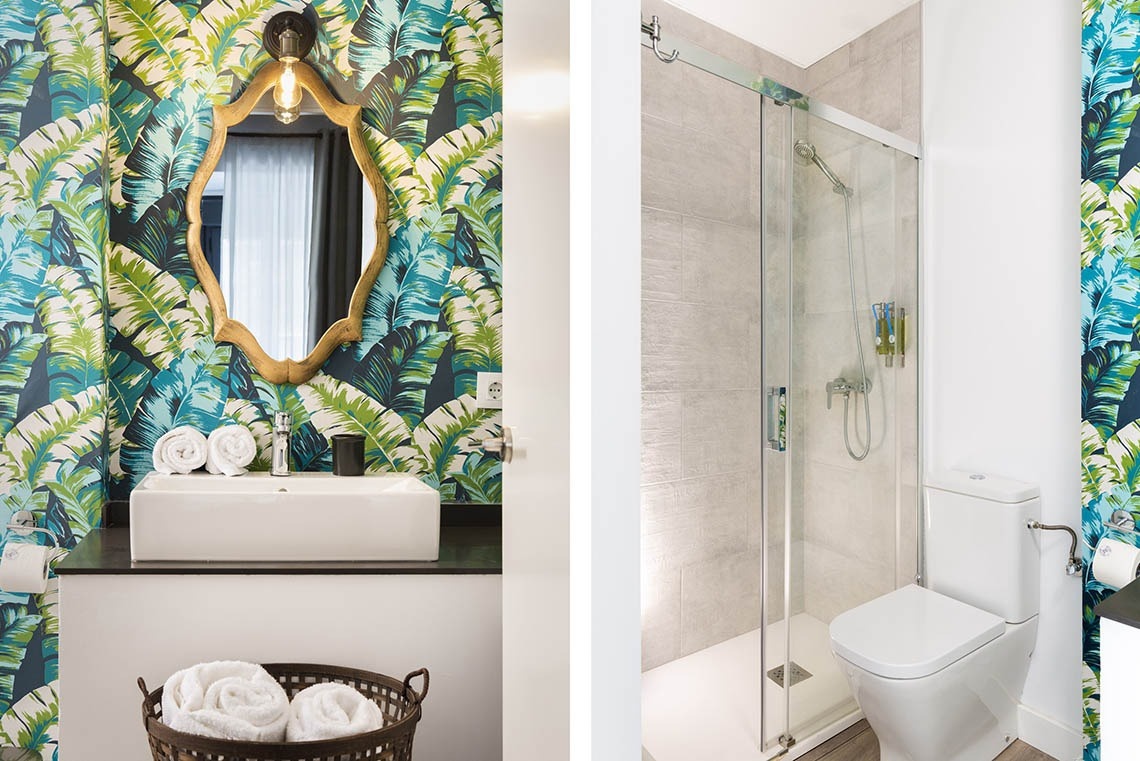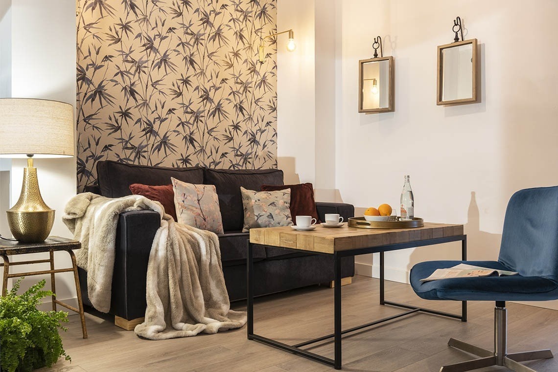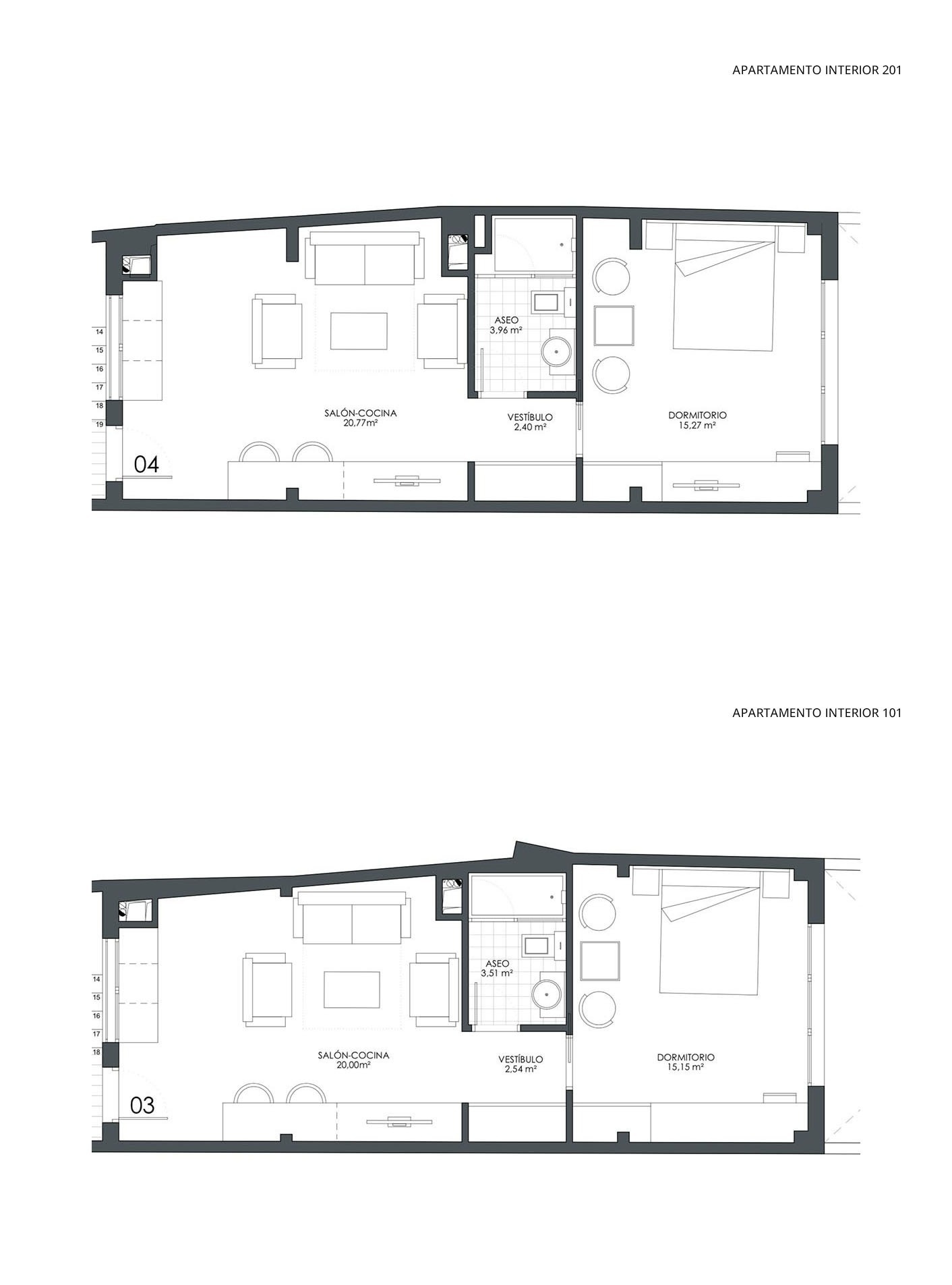 Nuestro apartamento con vistas al patio interior se compone de una zona abierta en la que conviven cocina y sala de estar en un mismo espacio. El dormitorio principal está equipado con una cama tamaño King Size (180 x200 cm) y zona de trabajo. El baño está totalmente equipado con ducha.