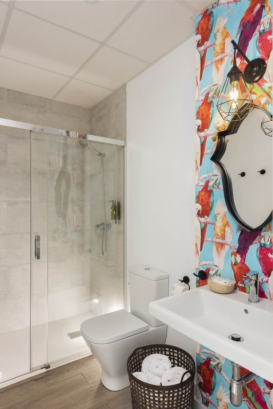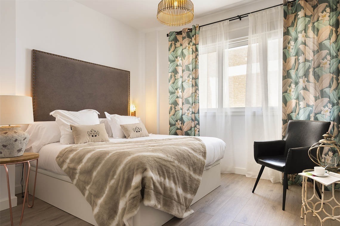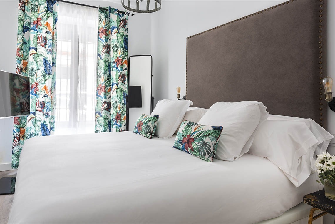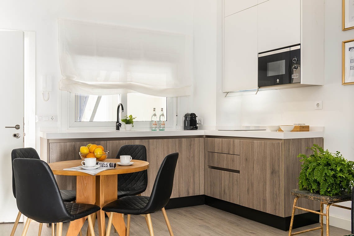 Our apartment overlooking the interior patio is made up of an open area in which the kitchen and living room coexist in the same space. The master bedroom is equipped with a King Size bed (180 x200 cm) and a work area. The bathroom is fully equipped with a shower.